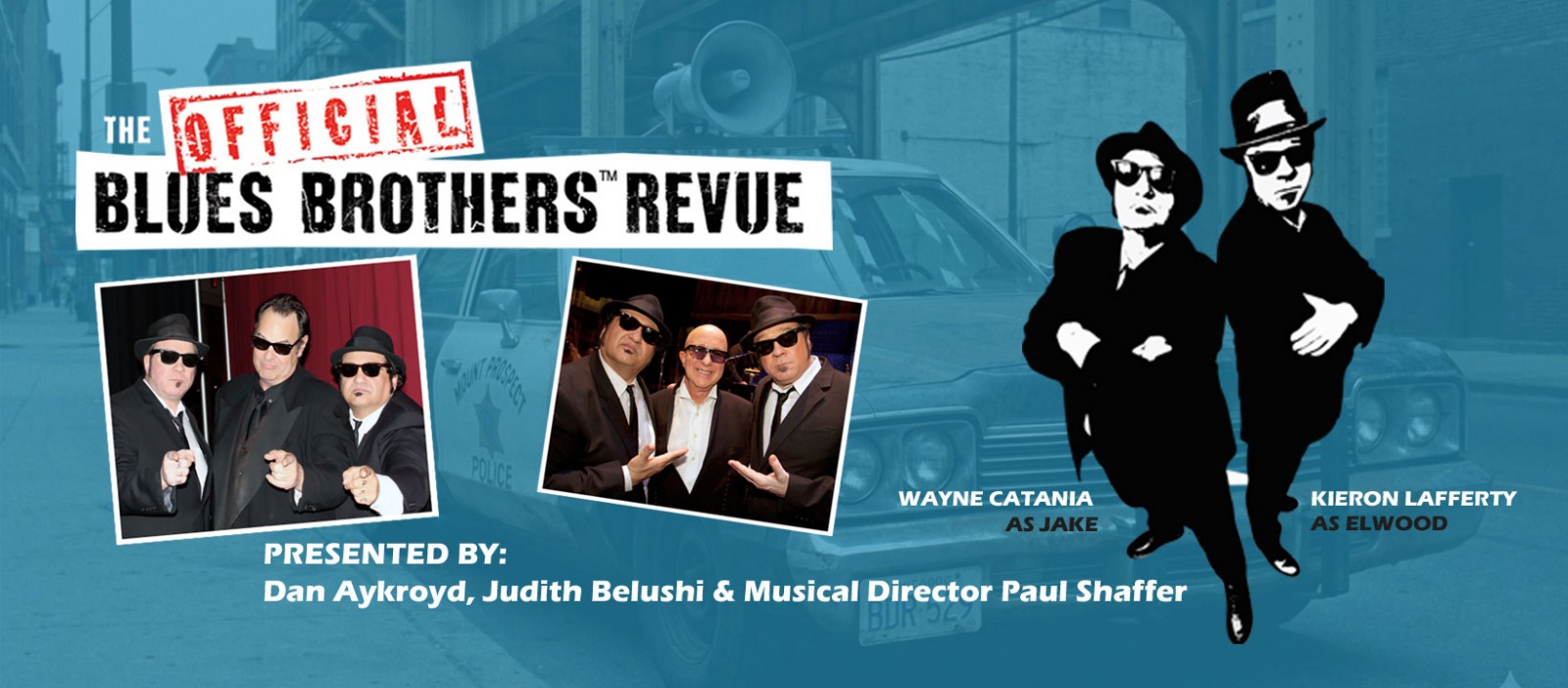 Judy Belushi, referring to the duo as anything but an imitation of the original act said, “Kieron and Wayne are not imitators, they live the music and embody the characters. They understand the spirit of The Blues Brothers and revel in the joy of being Jake and Elwood”. Backed by the all-star Intercontinental Rhythm & Blues Review Band, The Official Blues Brothers Revue is a multi-media interactive experience showcasing their undeniable talent in songs that comprise a virtual encyclopedia of rock, blues and soul. Audiences of all ages have been on their feet as the duo delivers classics such as “Soul Man,”, “Gimme Some Lovin,” , “Sweet Home Chicago” and “Shout.”